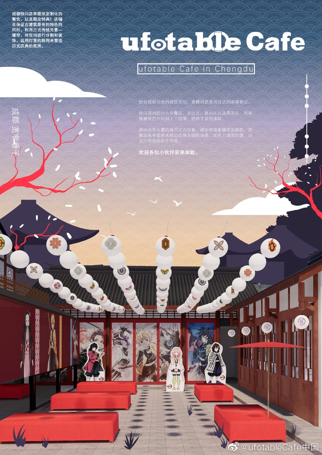经过多方选址和设计,ufotableCafe鬼灭之刃成都快闪店成功坐落在成都拥有百年历史的文化名城保护街区——宽窄巷子。