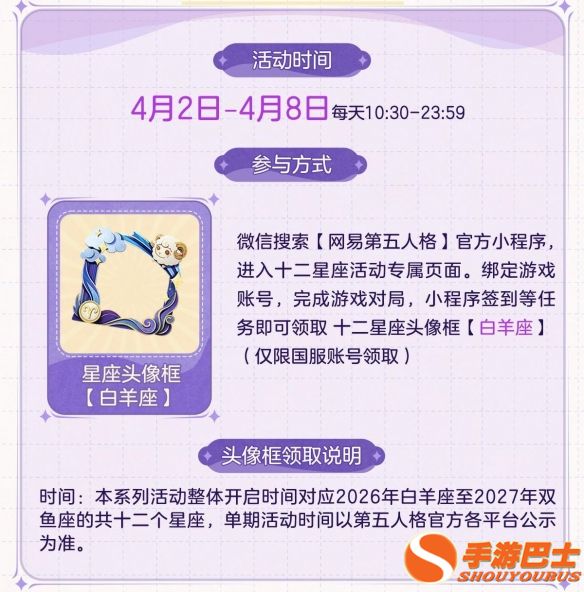 此外,十二星座线上活动将于4月2日10时30分至4月8日23时59分在【网易第五人格】官方小程序十二星座活动专属页面内开展,访客们在完成相应活动任务后即可领取十二星座头像框-【白羊座】。(仅限国服账号领取)