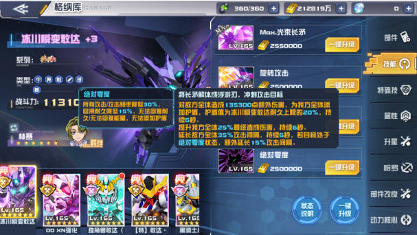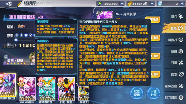 先来看它的核心输出手段——必杀技“光束长矛”。该技能可对敌方全体造成高额伤害并附加“冰封”效果,使目标无法行动、耐久上限降低、所有攻击大幅下降,同时每秒损失能量并承受无视防御的额外伤害。更为关键的是,当冰川瞬变敢达释放技能时,将使目标陷入“绝对零度”状态,每触发3次绝对零度效果还能额外造成无法行动的控制,形成层层递进的压制链条。