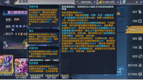 机师的羁绊技能“瞬变爆裂模式”同样不容小觑。开场即可提供长时间的免疫效果,涵盖瘫痪、沉默、不安、武器损坏、无法回复耐久乃至冰封等多种控制类型。当我方上阵5台浮游型或5台多模式型机体时,该技能将全面激活团队的战斗潜力:大幅降低敌方能量与耐久的回复速度,同时提升我方最终伤害与减伤能力。更为关键的是,冰川瞬变敢达每损失20%耐久,便能使敌方全体进入绝对零度状态,进一步强化团队的控制节奏。