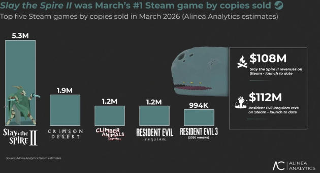 据分析机构Alinea Analytics的数据显示,《杀戮尖塔2》在2025年3月(抢先体验首月)取得了极为成功的开局。游戏于3月5日发售,当月销量估计达到530万份,仅Steam平台就创造了1.08亿美元的收入。而Pearl Abyss的《红色沙漠》以近200万份的销量位居第二。