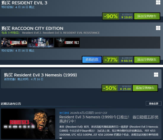 2026-04-07 《生化危机3》原版Steam售价竟比重制版还贵 玩家吐槽