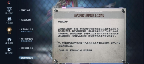至于这个调整公告,对于在游戏里经历过,这把武器独特之处的玩家来说,调整是最好的选择,而那些喜欢用这把武器的玩家,可能就要失落一阵了。不过作为刀战大神,不应该被一种武器左右,所有武器都会使用才是最厉害的,那么小伙伴们对于这把武器的调整有什么想说的呢?