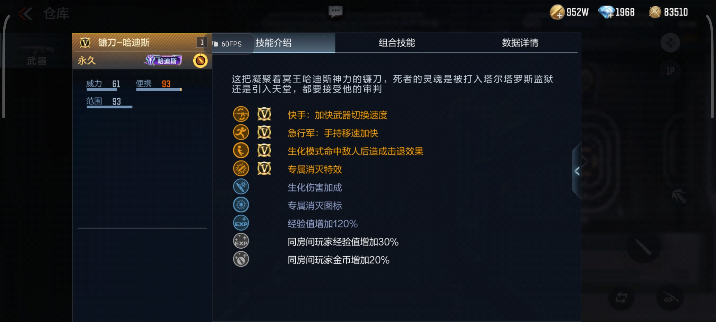作为哈迪斯套装的近战武器,这把刀拥有常规的快手、急行军双技能,除此之外生化模式中伤害得到了强化,在命中敌人时会造成击退效果,重击消灭敌人的时候会触发专属特效。