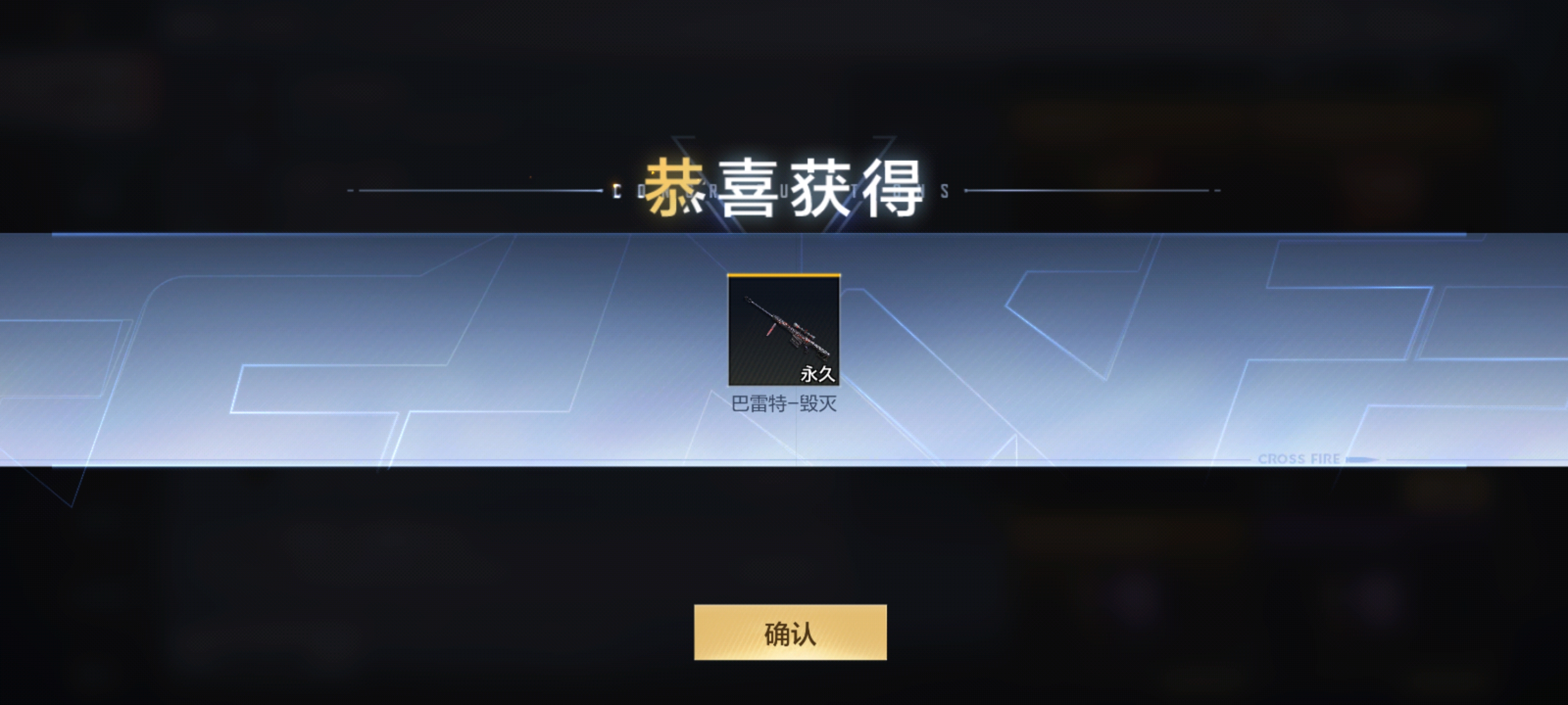 在黑市狂欢活动的时候,发现黑市里有一个1CFM币的皮肤宝箱,便抱着试试看地态度去买了,没想到一开,居然直接出了巴雷特-毁灭-EP永久皮肤!高兴地我简直要跳起来了!