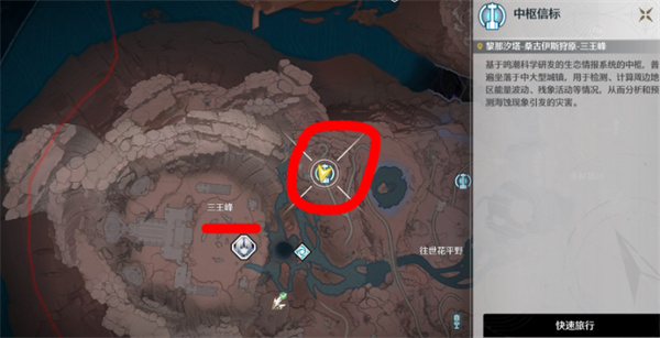 首先需通过地图传送至「黎那汐塔 - 桑古伊斯狩原」区域的 “三王峰” 右上角中枢信标。传送完成后,向东南方向眺望,能看到一棵造型独特的高大树木 —— 这便是本次互动的核心地点,也是尤诺的 “专属停留点”。若担心迷路,可打开地图放大查看,该树木在地形中属于明显地标,周围无密集障碍物。