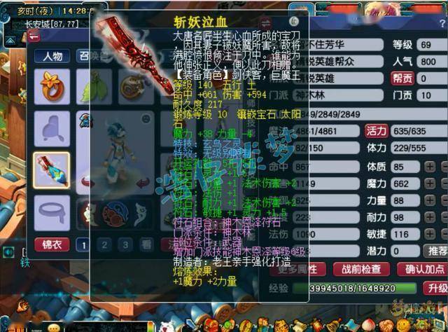 140级无级别玄鸟之灵武器,熔炼后加39魔、减2力,打了10锻太阳石。与其他装备相比,他的这把武器超标太多了。通过了解才得知他的武器是自己鉴定出来的,不得不说运气太好了,顶级法系神器。