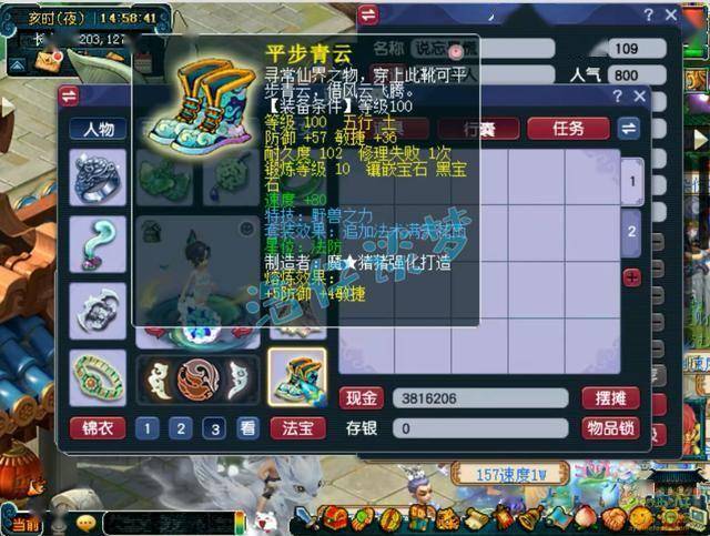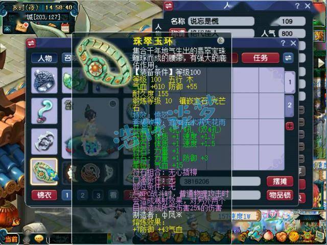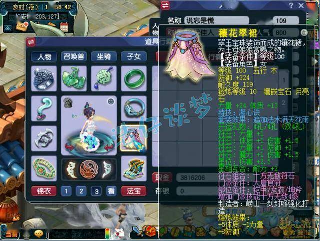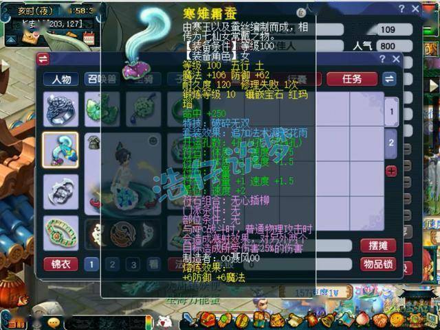 100级带凝心诀的满天花雨套女衣,熔炼后力体双加41,打了10锻月亮石。