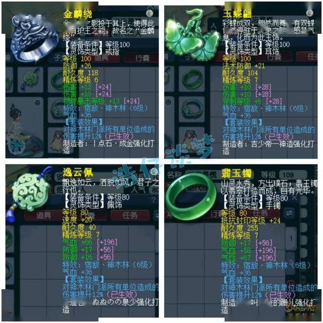戒指下排双伤害一物暴,耳饰下排双伤害一穿刺,配饰下排双防御一气血,手镯下排双气血一防御,特效选择了6级宿敌神木林。
