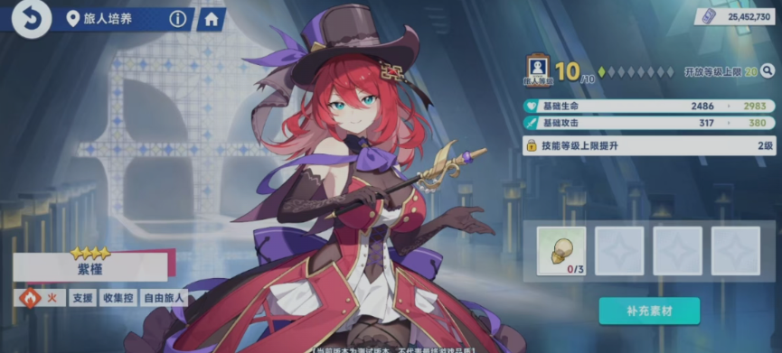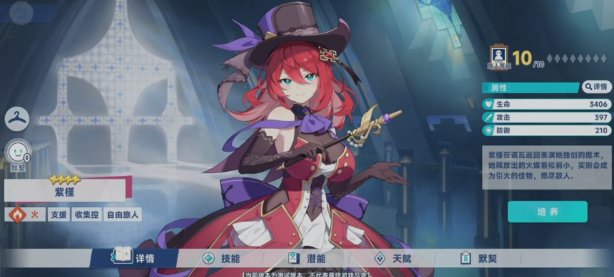 紫瑾用实力证明了四星角色的价值 —— 无需五星角色的养成成本,却能凭借全面的技能机制撑起一队战力。无论是刚入门的新手,还是资源有限的平民玩家,只要围绕 "主控输出 + 技能联动 + 印记叠加" 的核心思路培养,就能让这位戴魔术帽的火舞姬成为战场上的绝对焦点。如果你想打造一支低成本、高战力的火系队伍,紫瑾绝对是不容错过的核心人选。