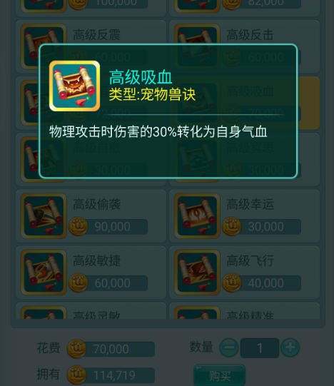 伤害输出固然重要,但若能边打边回血,让宠物拥有更强的续航能力,那便是锦上添花。这里我推荐高级吸血这个技能,它可以吸收物理伤害的30%来恢复自身气血,有了它,宠物便能越战越勇,在持久战中占据上风。