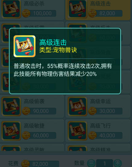 另一个同样出色的技能是高级连击——既然一下打不倒,那就再来一下。此技能让宠物在物理攻击时有55%的概率连续攻击两次,虽然会使所有物理伤害降低20%,但综合计算下来,整体增伤效果依然十分可观,堪称性价比之选。