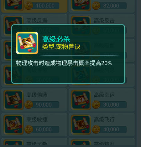 作为一只合格的物理宠,输出类技能自然是重中之重。首推的技能当属高级必杀,它可以提升宠物20%的物理暴击概率,让每一次出手都有机会打出爆炸性的伤害,瞬间扭转战局。