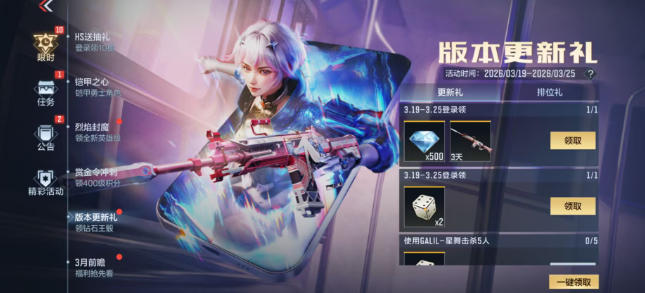 版本更新后登录即可领取500钻石、王者之骰x2。另外,在版本更新礼活动中还可以领取到GALIL-星舞(3天),一起来体验新武器哦!使用GALIL-星舞击杀5人还能再领取1个王者之骰~