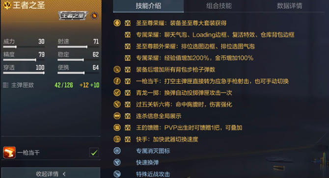 首先是一枪当千,打空主弹匣直接转为应急手枪射击,也可手动切换。该属性在步枪系列中尤为特殊,当实战对敌中,主武器弹匣的数量很快就会消耗掉,换弹则需要几秒的时间。但是装备王者之圣后,这几秒钟就是胜利的关键,可快速切换到应急手枪射击,填补了换弹时间,抢先一步拿下先机。