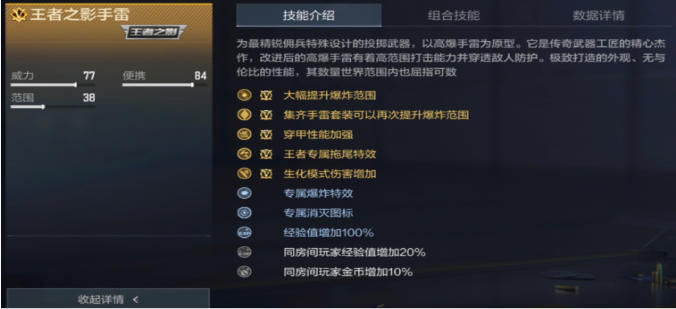 作为CFM首款王者级投掷套装成员,王者之影手雷的最大优势在于其4.06米的爆炸范围,是目前所有王者手雷中范围最广的。