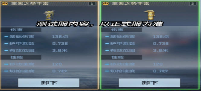将王者之圣手雷与王者之势手雷对比可以看到,双方武器数据完全一致。