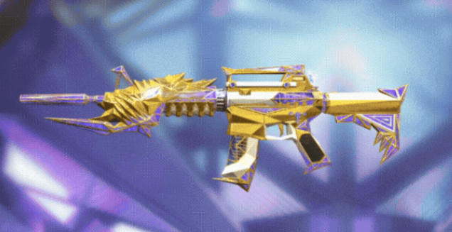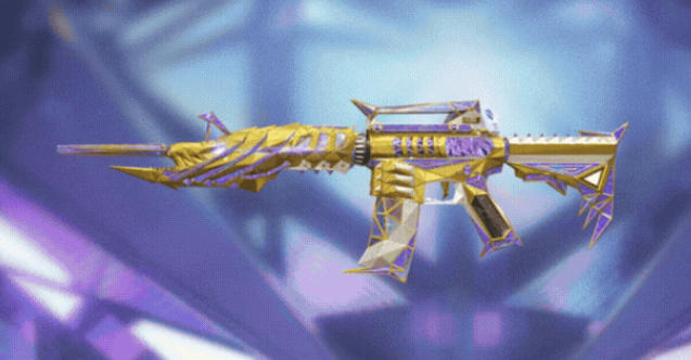 王者之戮-HeartShot同样以鎏金筑基,搭配通透紫水晶,消音器细长,紫金双色交织,攻击性拉满;枪管布满齿轮状金色棘刺,与半透紫水晶交错碰撞,武器光影流转间尽显璀璨。握把、枪托处全面包裹水晶,尾部倒钩设计进一步强化凌厉气场,华丽且极具压迫感。