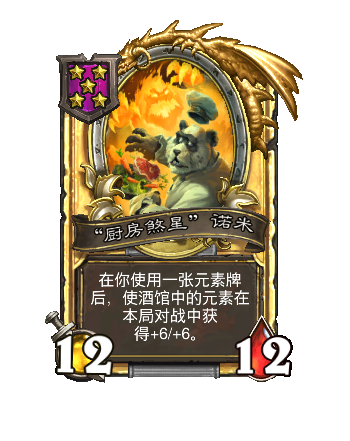 改动前:4/4。在你使用一张元素牌后,使酒馆中的元素在本局对战中获得+2/+2。