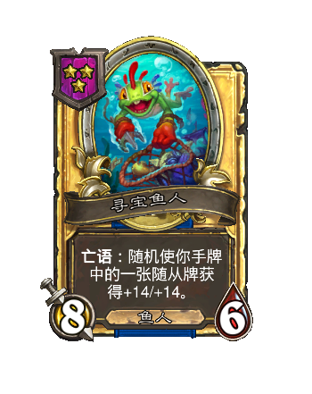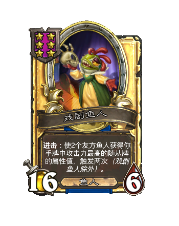 改动后:8/3。进击:使2个友方鱼人获得你手牌中攻击力最高的随从牌的属性值(戏剧鱼人除外)。