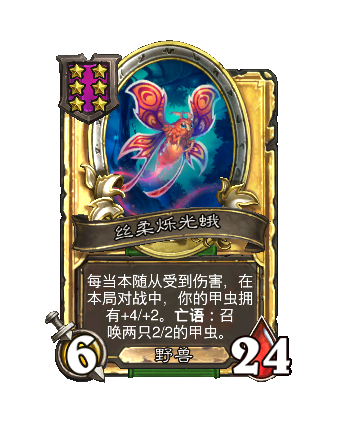 改动后:3/12。每当本随从受到伤害,在本局对战中,你的甲虫拥有+2/+1。亡语:召唤一只2/2的甲虫。