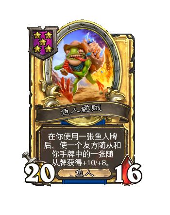 改动后:10/8。在你使用一张鱼人牌后,使一个友方随从和你手牌中的一张随从牌获得+5/+4。