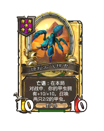 改动后:5/5。亡语:在本局对战中,你的甲虫拥有+5/+5。召唤一只2/2的甲虫。