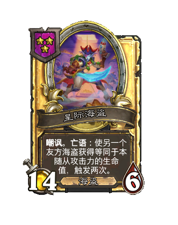 改动后:金色版本:在你使用一张等级4或以上的牌后,使你的海盗获得+3/+2,触发两次。