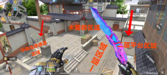 B包点是一个半开放式中式庭院结构,核心区域是石板铺就,主要由木箱群、二层平台、中路连接通道、一层四个小建筑单位构成。该区域小建筑错落分布,目不暇接,这种布局既为该区域提供掩体,又制造了部分地图视野盲区,攻防博弈性强,接下来会对上述位置进行详细说明。