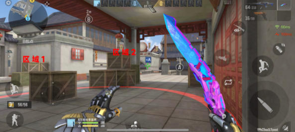 该位置是B包点的核心区域,堆叠着多组高低错落的木箱,是整个区域最重要的掩体,图中标记的区域1的矮木箱可用于蹲守、闪身对枪,适合步枪手近距离交火;区域2的高木箱可作为半身掩体,也能通过跳跃获得更高视野,压制对面通道高点的狙击。