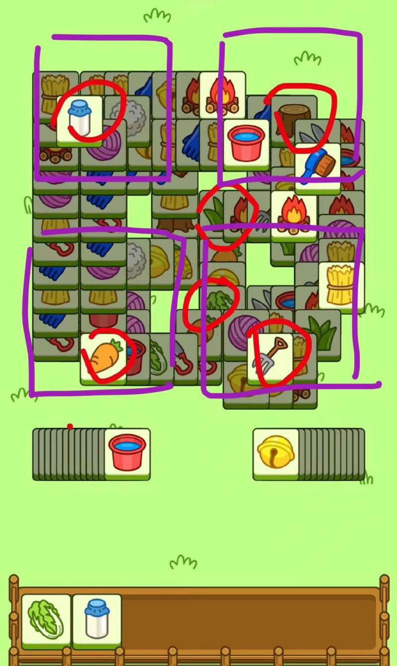 我消的方法也是按照一个玩家无道具通关思路是左上、左下、右上、右下选择一一个方位单独消除找出所在处的两种唯一三张牌消除(例如白菜胡萝卜/刷子木桩/叉子小草/组合)PS:左右盲牌可用辅助失误。