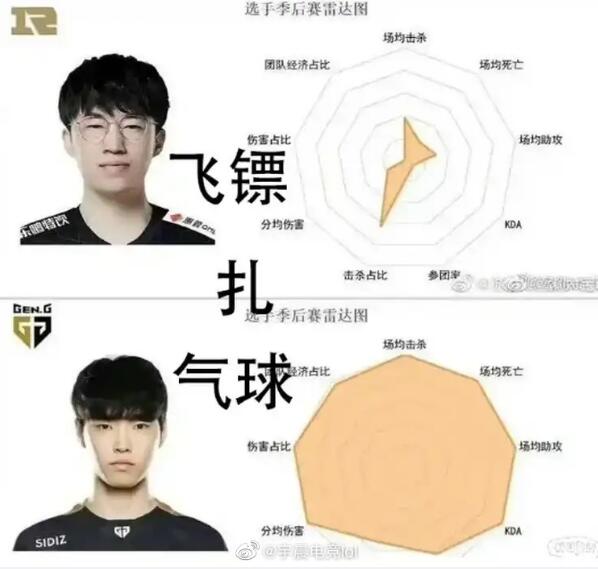 在这张雷达图中Gen.G中单选手chovy的各项数据都是拉满的,堪称六边形战士,让雷达图看起来就像气球一样。而RNG中单选手小虎因为季后赛的表现,导致雷达图只有击杀占比高,雷达图像个飞镖一样。