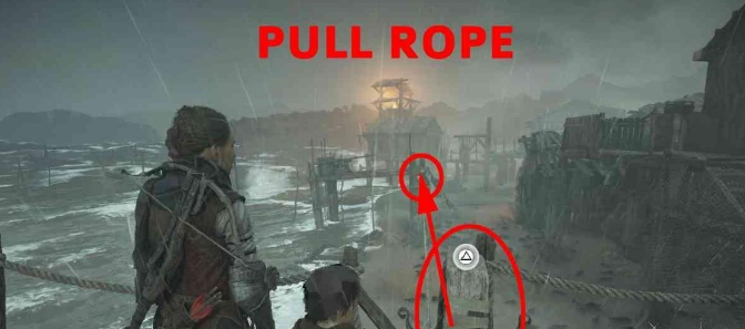 抵达村子后,来到海边的码头上,拉动绳索将远处的木质结构扯断,然后控制下边的老鼠去远处,迅速跑到海滩上打开箱子