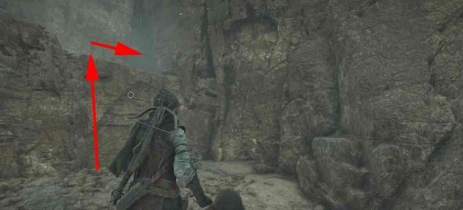 推开板子穿过缝隙来到另一边,左拐爬到上边平台,拿起火把进入洞穴深处,调查带手印的墙壁