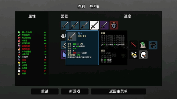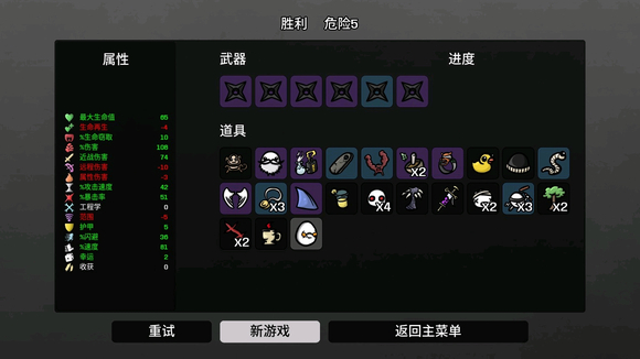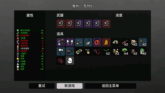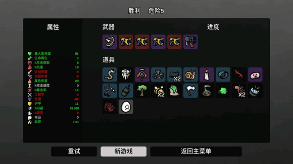 钱的利用就很重要了,优先拿武器。多用来刷新,十级以后用来刷升级的加成也非常赚。升级加成缺什么拿什么就行。树枝流玩生命回复挺好的。