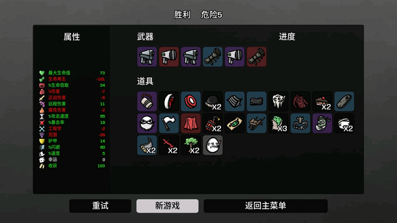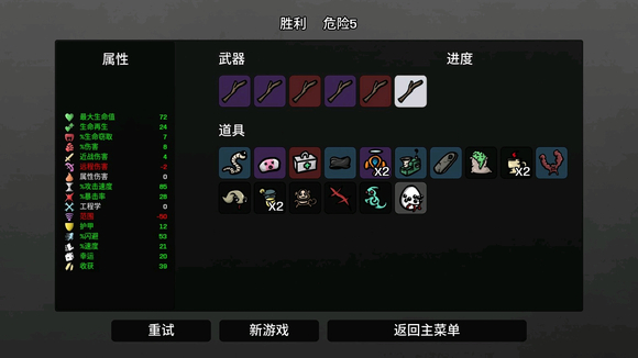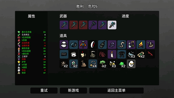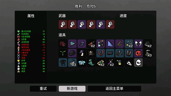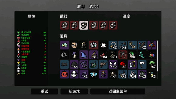 开局一个石头,随便拿一个武器。然后打完第一波买了石头,刷一下看见了盾牌,果断抓了。后面就是拿盾牌,叠收获,然后叠防御移速回复,就轻松过了。