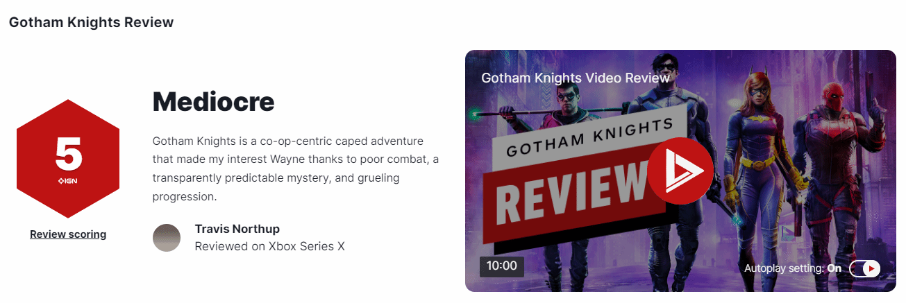 《哥谭骑士》这次重回哥谭市令人失望,与过去十多年的蝙蝠侠游戏相比,这是一个明显的退步。合作模式能够在哥谭跑来跑去有着不错的乐趣,四个角色的每个对话和动作也都有不错的表现,但游戏的基础很差,我没办法推荐这款游戏。帧率的不稳定、故事性薄弱、并不良好的战斗以及各种各样的问题都能让我确认,我不敢想象到身边有朋友会因其而回归。