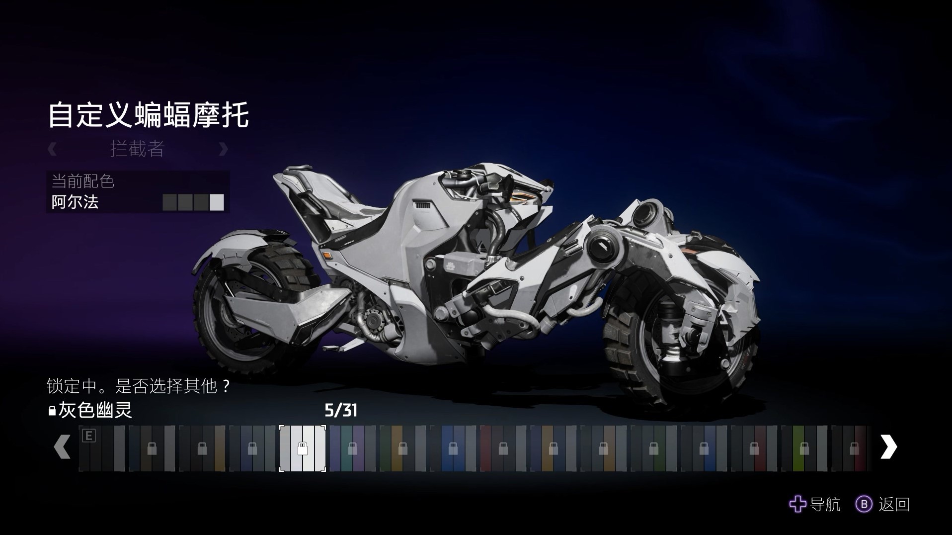 另外,本作中玩家不能像《阿卡姆骑士》里那样开着全副武装的蝙蝠车了,而是改用全新的蝙蝠摩托来代步。它的速度依然风驰电掣,奔驰在街道上也十分灵活,但没有装配炮火,也几乎不支持自定义——你能更改的只有它外部的涂装,而游戏甚至没有明确告诉玩家涂装的获取方式,以至于我直到通关也没有解锁其中的任何一款。