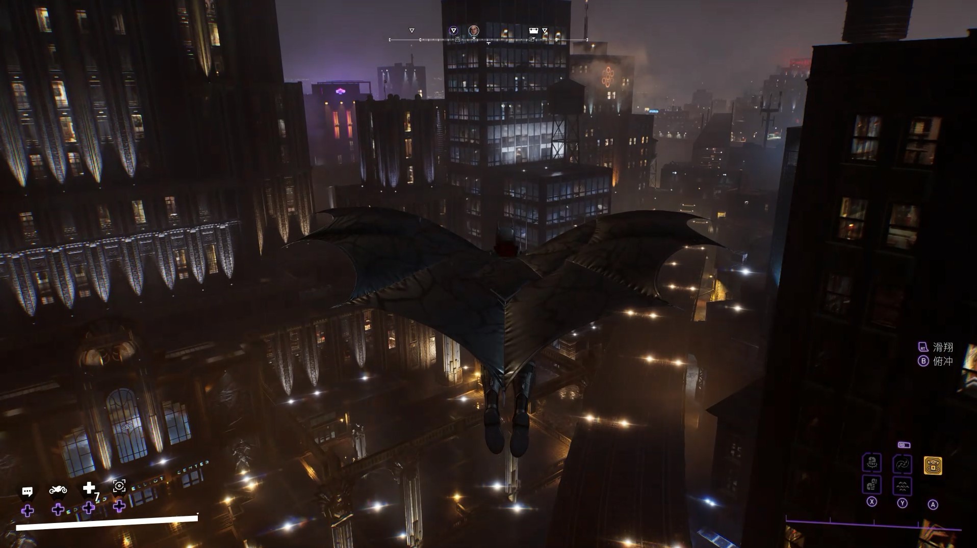 当然,你也可以利用钩索在楼宇间穿梭,体会呼啸而过的感觉,许多时候这比驾车赶路更加灵活,也要更加爽快。不过,用于滑翔的披风等能力一开始无法获得,要等玩家完成了角色专属的“骑士”挑战才能够使用,而游戏却从未告诉玩家这一点。这让我直到游戏后期清支线的时候才发现——原来本作还有滑翔系统。