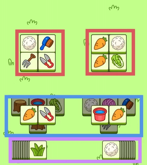 开局先消除橙色圈出来的地方,消除完表面牌之后可以看到两个红色区显露出来,用这两个地方互相消除,必要时再搭配紫色盲盒区消除。