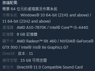 *PC硬件配备至少得有上图的水平,由于是用DXVK-Async做DX11转Vulkan(VK),用Vulkan的条件就是 显示卡至少是 HD7000系以后的A卡/GTX600系以后的N卡/2015年底Intel CPU的iGPU。