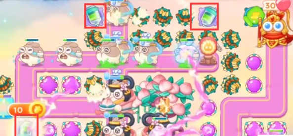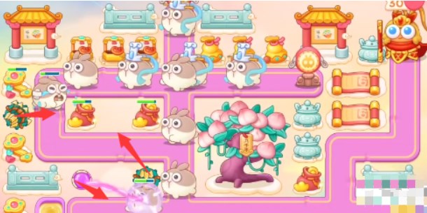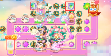 3、第一波跑车兔打完之后,没有盾牌小兔子可以剩下5-6只,留出一点时间清理左边障碍物,之后在萝卜附近建立瓶子炮,等到兔子走到那里进行清理。