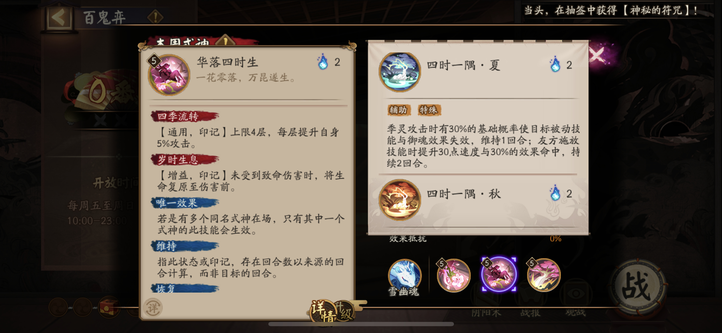 季灵攻击时有30%的基础概率使目标被动技能与御魂效果失效,维持1回合;友方施放技能时提升30点速度与30%的效果命中,持续2回合。