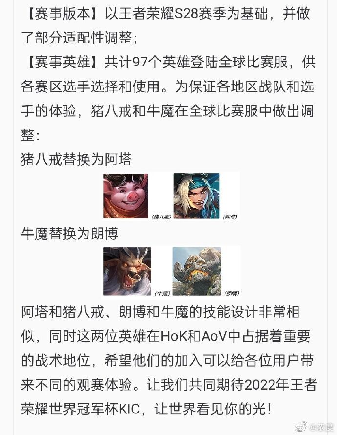 世冠全球比赛服的游戏版本是以《王者荣耀》S28赛季为基础的。简单来说就是:世冠采用的是《王者荣耀》S28赛季的游戏版本,不过一些英雄被“禁用”,而猪八戒以及牛魔这两个英雄的模型变了。