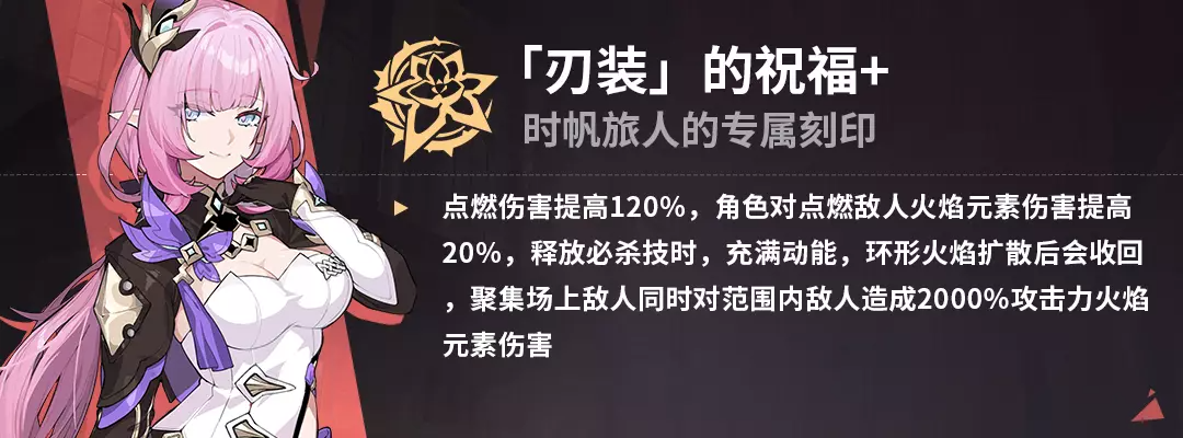 回到专属【刃装】,它最大的提升在于必杀后能回满动能,让爱衣迅速启动γ锯盘。其他增益则提升不大,不过这个环形火焰收回,满满的既视感,有点类似于迷迭的专属刻印【魔女】