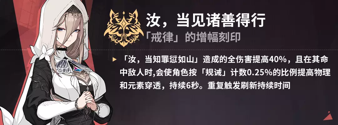 戒律Ⅱ的发力期在解锁核心后。它的普通刻印无法加成环刃,好在开局双专已经足够应付低压力的四层双倍,可以放心选择。戒律Ⅱ核心的全局全伤、增幅的穿透与易伤都相当给力,另外还能利用戒律必杀被武器减半的性质触发减半易伤刻印,覆盖率拉满,但需要至少3个回规诫计数的刻印才能维持减半。