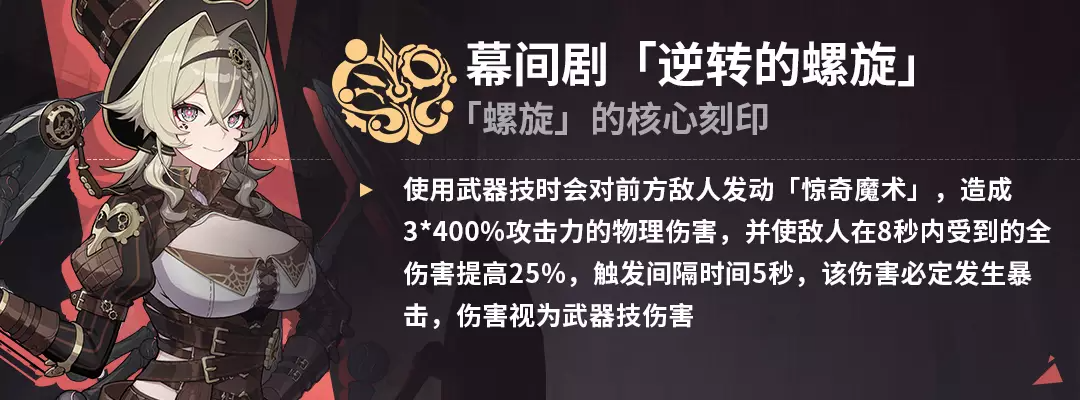 考虑到螺旋Ⅱ的长时空与聚怪特性会干扰火圈聚怪,影响输出效率,爱衣不推荐使用螺旋Ⅱ,但核心带易伤的螺旋Ⅰ就很好用了。环刃既是远程又是武器伤害,螺旋的3普通全伤刻印都能发挥;而Ⅰ核心配合普通易伤刻印又有大量易伤,相当好用。此外,螺旋Ⅰ核心伤害类型为物理,可以触发物理伤害提升火伤加成因子,本期使用效果拔群。