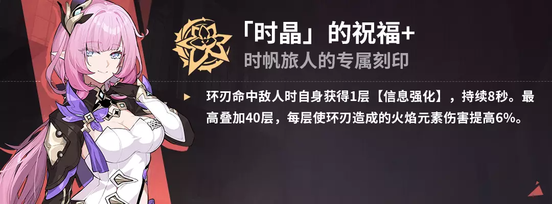 【时晶】主要提升环刃加成。以γ锯盘的攻击频率,爱衣能轻松叠满【信息强化】层数,获得上限240%火伤加成。【时晶】的数值十分夸张,故推荐爱衣开局凹下双专,通关会轻松许多。