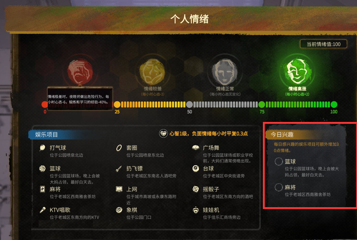 这几天都是连续搬砖2次,然后打开心情栏。利用下班后的黄昏时间完成心情栏的任务,完成一个就是30心情,两个就是60。