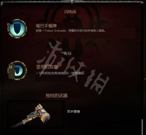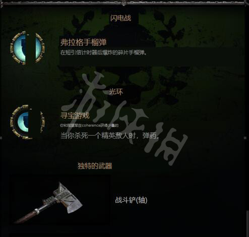 初始装备一把单手斧和小冲锋枪。能力F是往前冲锋或向敌人,顺带回韧性并提高下次近战攻击,手雷G眩晕麻痹范围内敌人。
